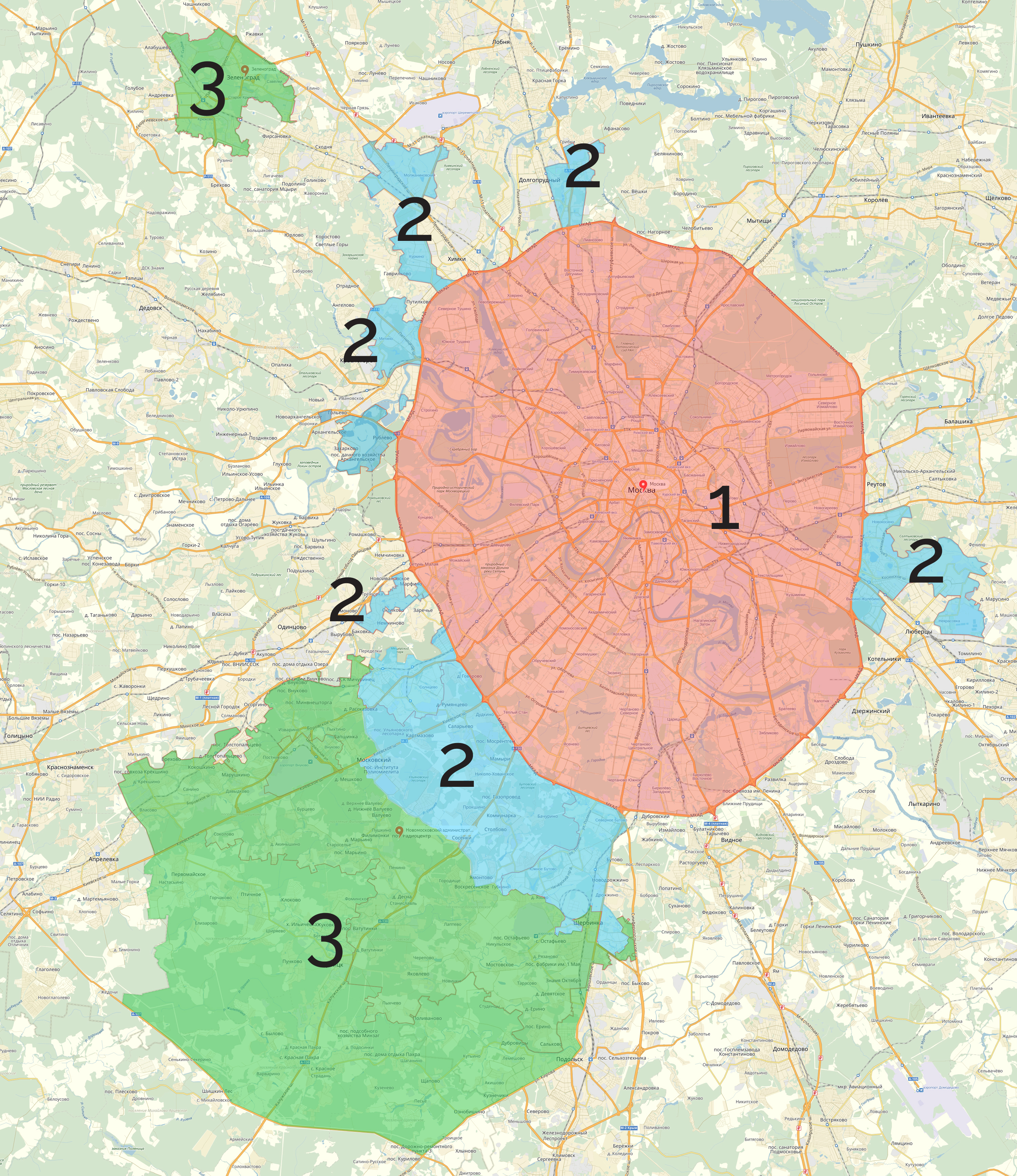 Зона №3 — см. зеленый цвет — Москва, за пределами МКАД, свыше 10 км, но не далее трассы А-107 (Московского малого кольца); Зеленоград: